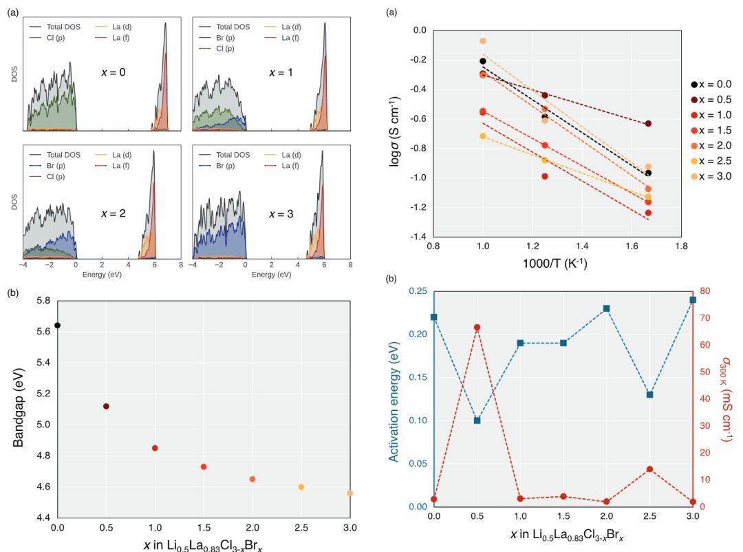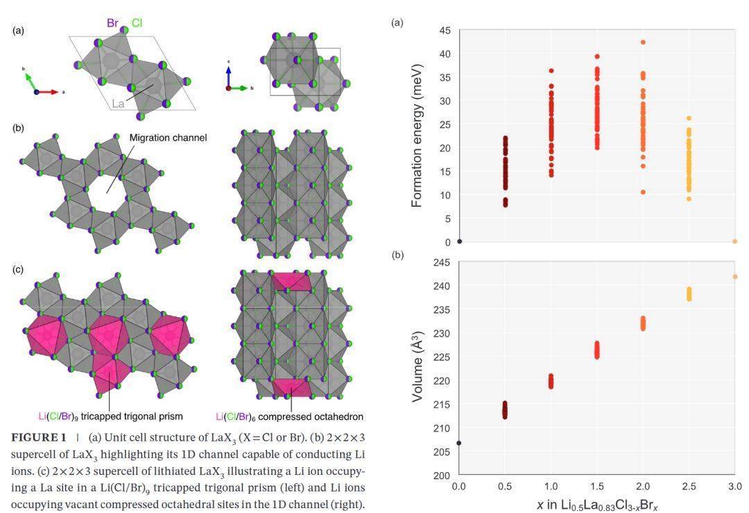 在固态电解质优化研究中,纽卡斯尔大学团队针对LaCl₃−xBrₓ体系开展的阴离子混合设计研究,展现了DFT(密度泛函理论)与分子动力学模拟结合在电解质离子传导机制解析中的典型应用。